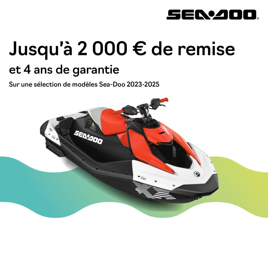 2 000 € de remise et 24 mois de garantie supplémentaire applicables sur Sea-Doo RXP, GTI, Explorer, Wake, RXT, GTR, Fish, GTX (2023-2024)